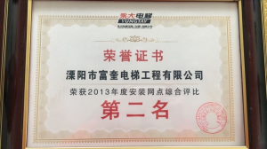 溧陽市富奎電梯工程有限公司 溧陽市富奎電梯工程有限公司是于二OO八年一月九日在原前身溧陽市電梯工程公司基礎(chǔ)上成立的,是專業(yè)從事電梯銷售安裝維修、保養(yǎng)的企業(yè)。是國家質(zhì)監(jiān)總局頒發(fā)的特種設(shè)備安裝、改造、維修A級安裝許可證單位。公司組織機(jī)構(gòu)實行總經(jīng)理負(fù)責(zé)制,公司下設(shè)管理部、銷售部、安裝維修部、質(zhì)安部、財務(wù)部,公司另外設(shè)十二個分公司:四川分公司、江蘇分公司、上海分公司、浙江分公司、湖南分公司、遼寧分公司、山東分...